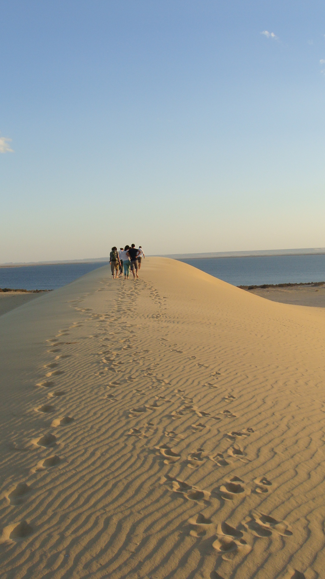 Non loin des cascades (revenir en arrière sur la piste puis bifurquer à gauche jusqu’à revenir sur les berges du lac), se trouve une écolodge abandonnée, dont on peut emprunter les chaises pour boire le thé (si l’on est équipé), tout en admirant le coucher du soleil sur le lac. Pour notre part, nous l’avons regardé depuis la crête d’une dune de sable fin bordant l’écolodge. La quiétude du lieu n’était troublée que par deux mobylettes (que faisaient-elles là, mystère). Nous avons déguerpi quand un groupe de jeunes gens échevelés s’est mis à courir dans notre direction (rien d’agressif, mais pas mal de décibels, et nous en avons plus que notre dose au Caire).