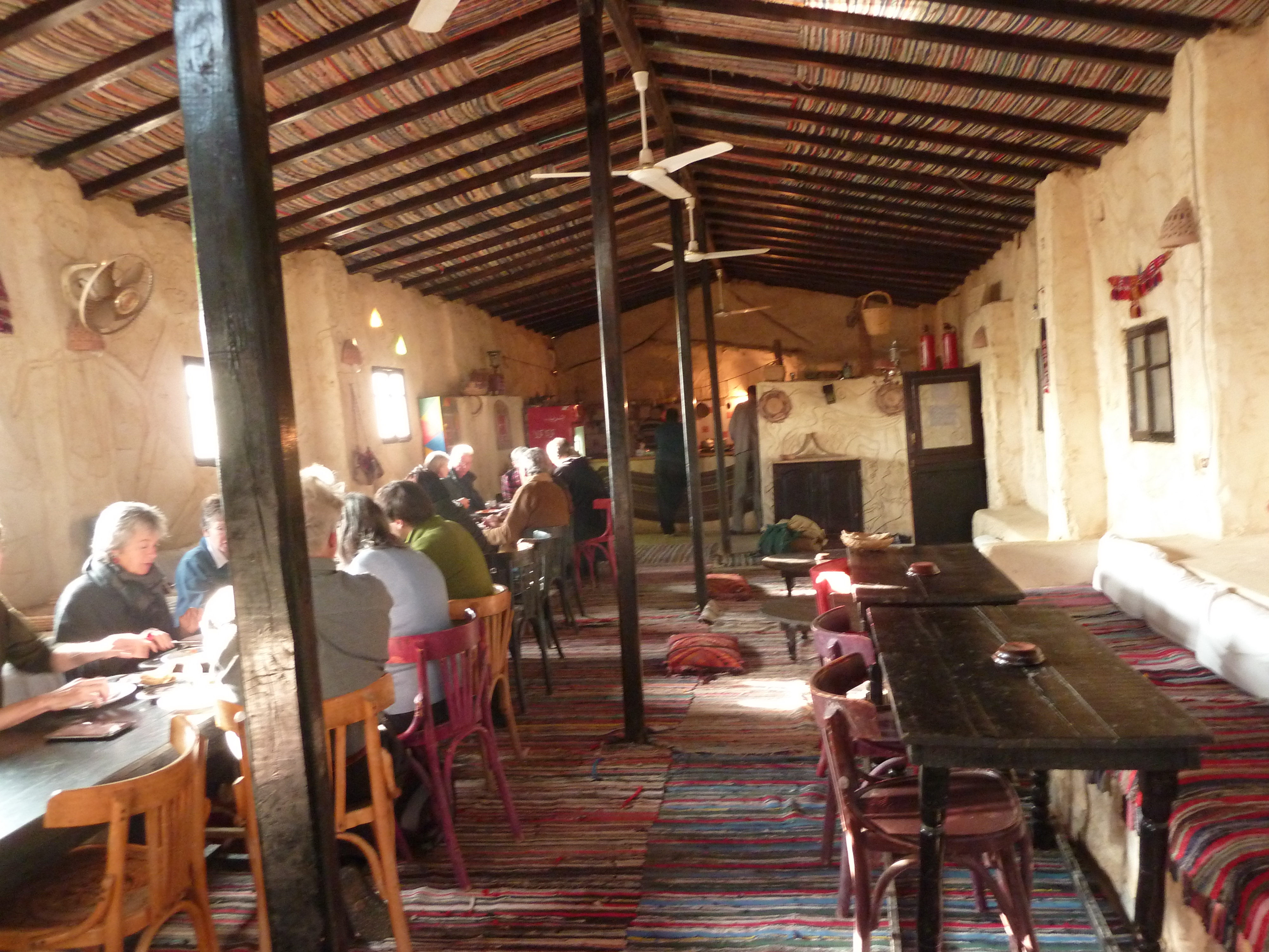 L’écolodge propose de grandes « terrasses » couvertes, sur lesquelles on s’installe sur des coussins et des tapis. Il est proposé à boire (thé, bières, jus de citron…), à manger (mezze, et plats de viande ou de poisson). La soirée se déroule un peu hors du temps, au point qu’en se couchant à minuit à peine passée, on a plutôt l’impression qu’il est 4h du matin !