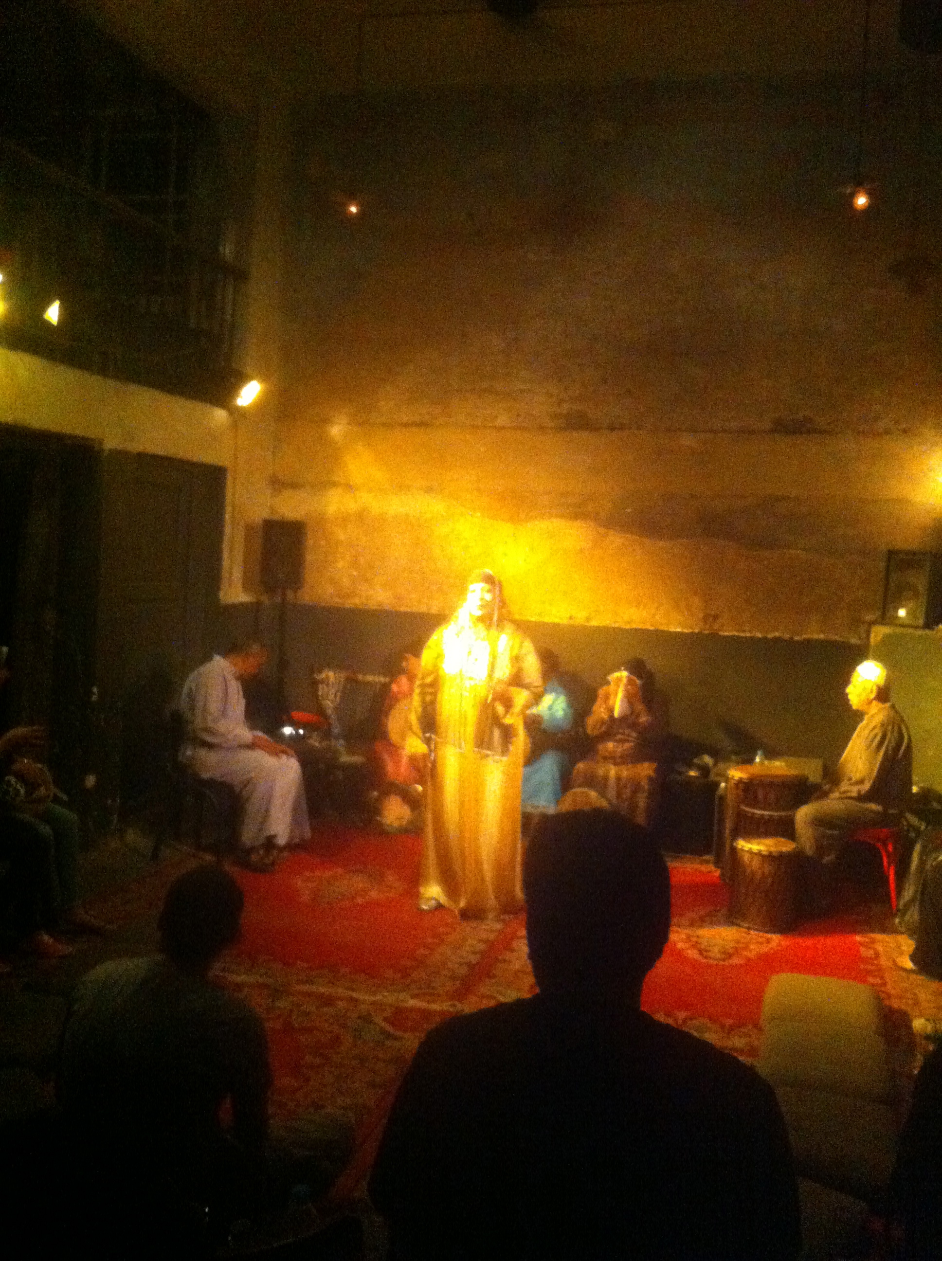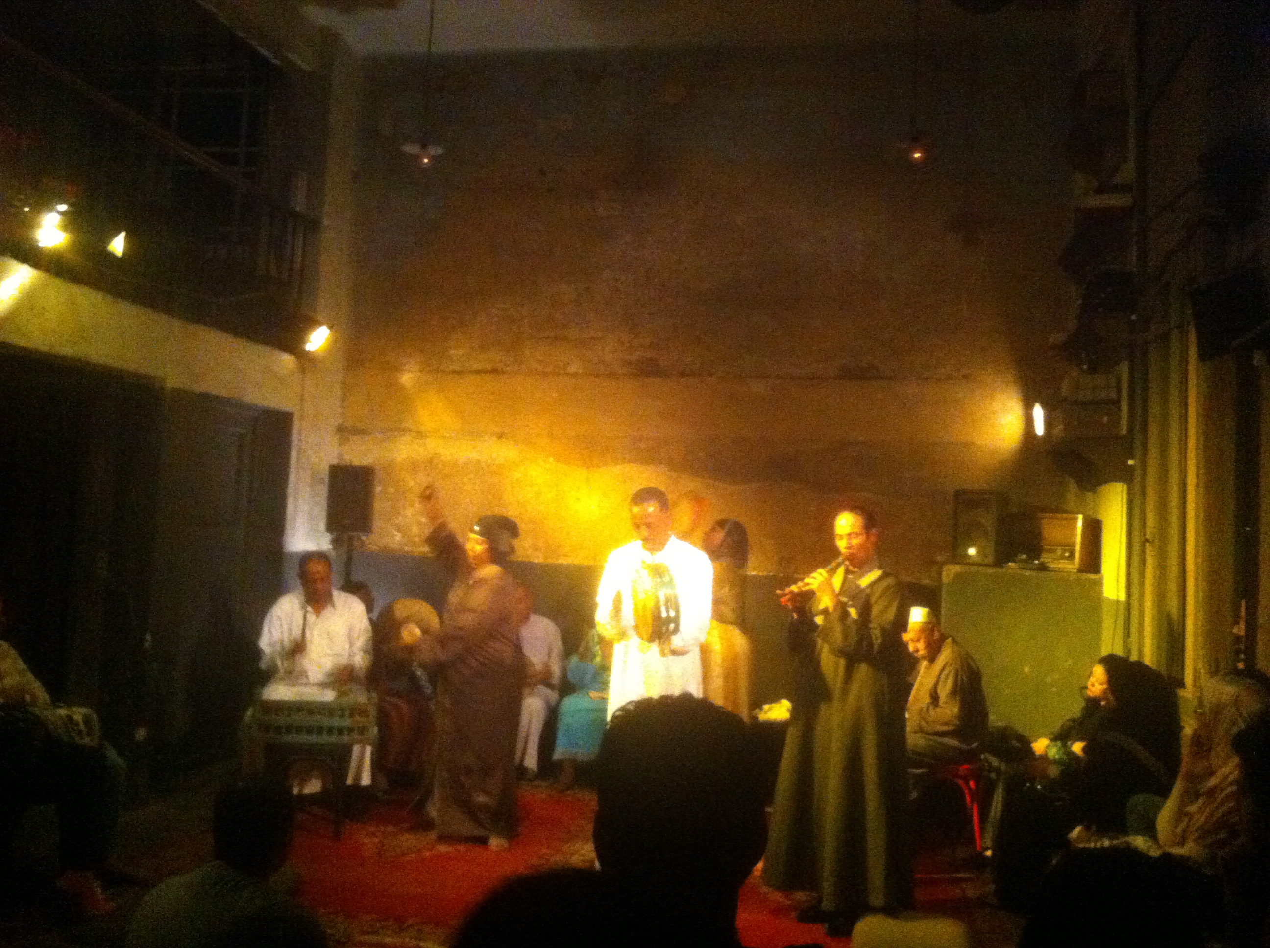 Le groupe se produisant ce soir-là est composé d’une dizaine de chanteurs et de musiciens, hommes et femmes en habits traditionnels (galabeyas pour les hommes, voiles noirs attachés par un nœud sur le côté et robes pailletées pour les femmes), dans la soixantaine.