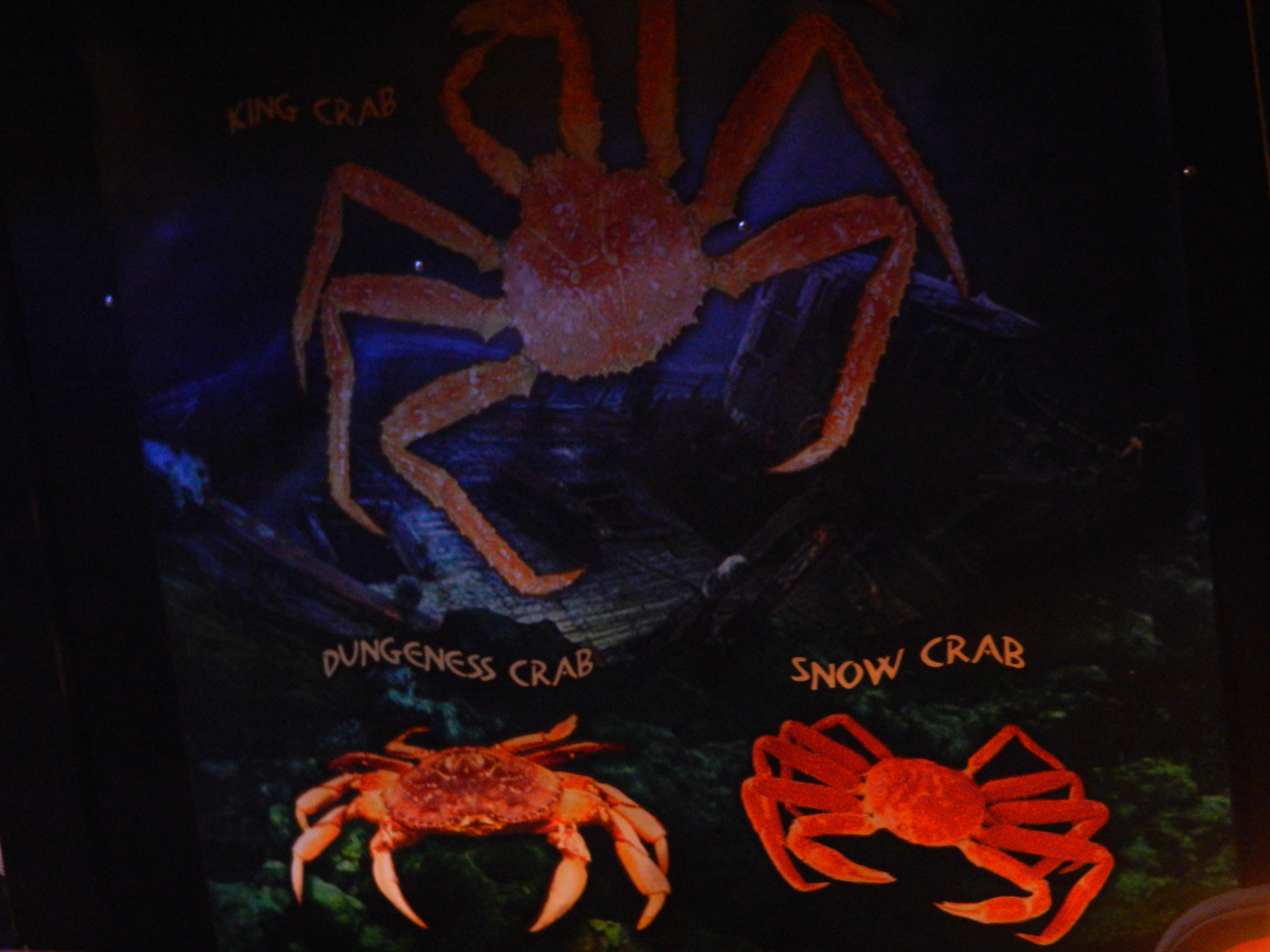 Nous avons choisi l’un des mélanges de fruits de mer, avec crevettes, moules, coques, maïs, rondelles de saucisses, et les trois crabes ci-dessous (le plus gros dont le nom n’est pas très visible, c’est le king crab) :