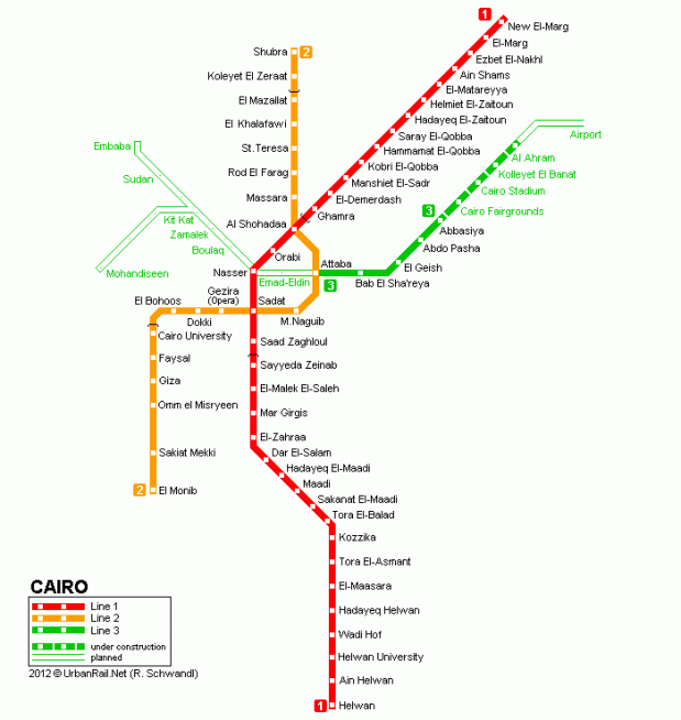 Voici la carte du Métro du Caire. Le projet pour lequel nous travaillons réalise la ligne 3 (en vert). La partie Attaba-Abbasiya a été inaugurée en janvier 2012. Elle est très, très fréquentée (il y a notamment une université à Abbasiya).