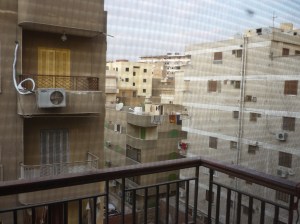 Puis Marwa, qui aime beaucoup cuisiner, est partie aider un peu sa maman. J’ai pu observer la vue du balcon (c’est la moustiquaire qui fait l’effet grillage):