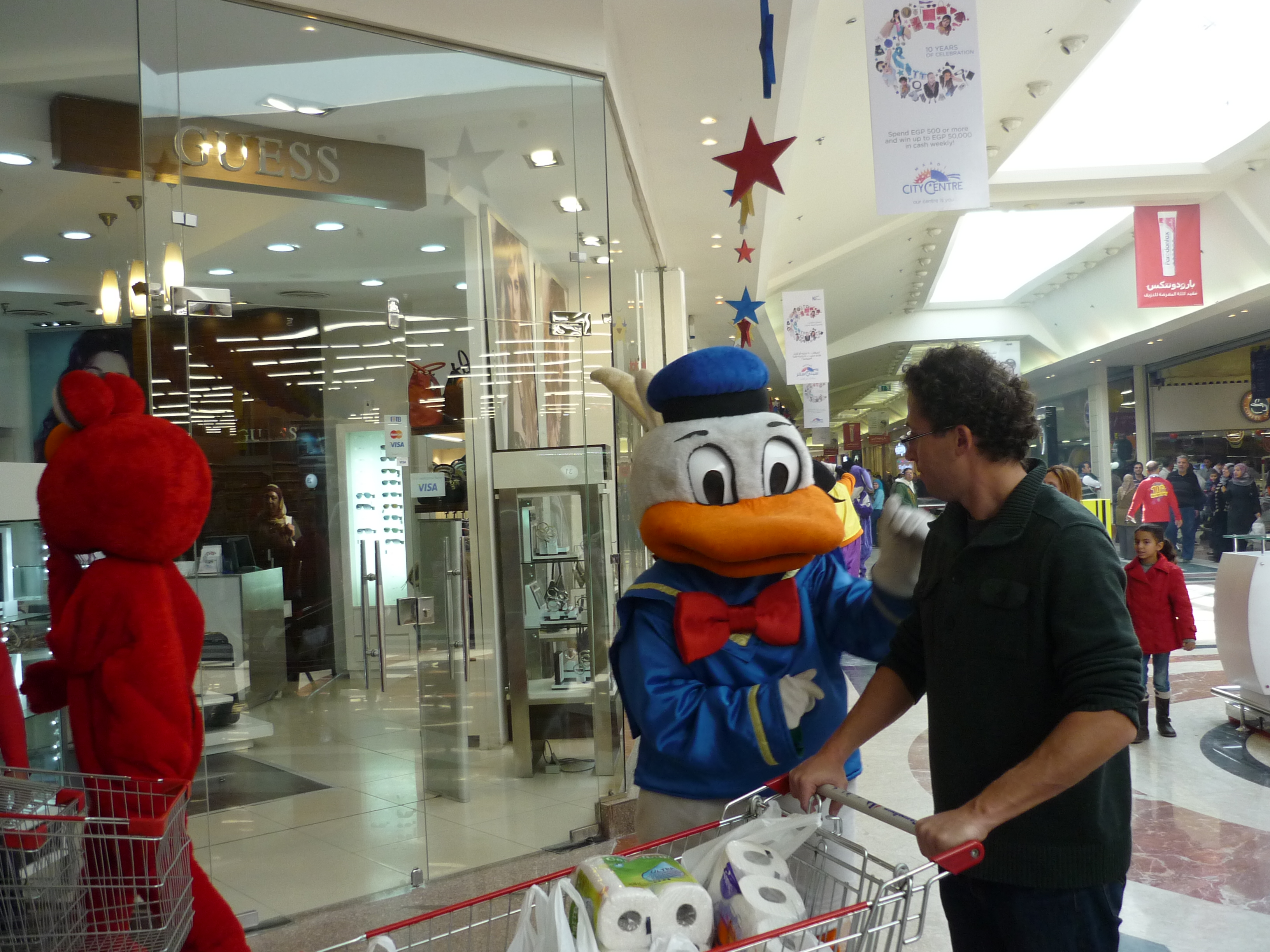 Quand enfin nous parvenons à atteindre les caisses, à payer, à ressortir du carrefour… horreur et damnation ! Des animaux géants foncent droit sur nous ! Un lapin, un Mickey, un Donald, un Pluto ! Help ! Geo parvient à embobiner le canard géant, tandis qu’Emy continue d’entraîner le chariot vers la sortie de la galerie, et que le lapin géant se fait plaquer par les gardes sécurité.