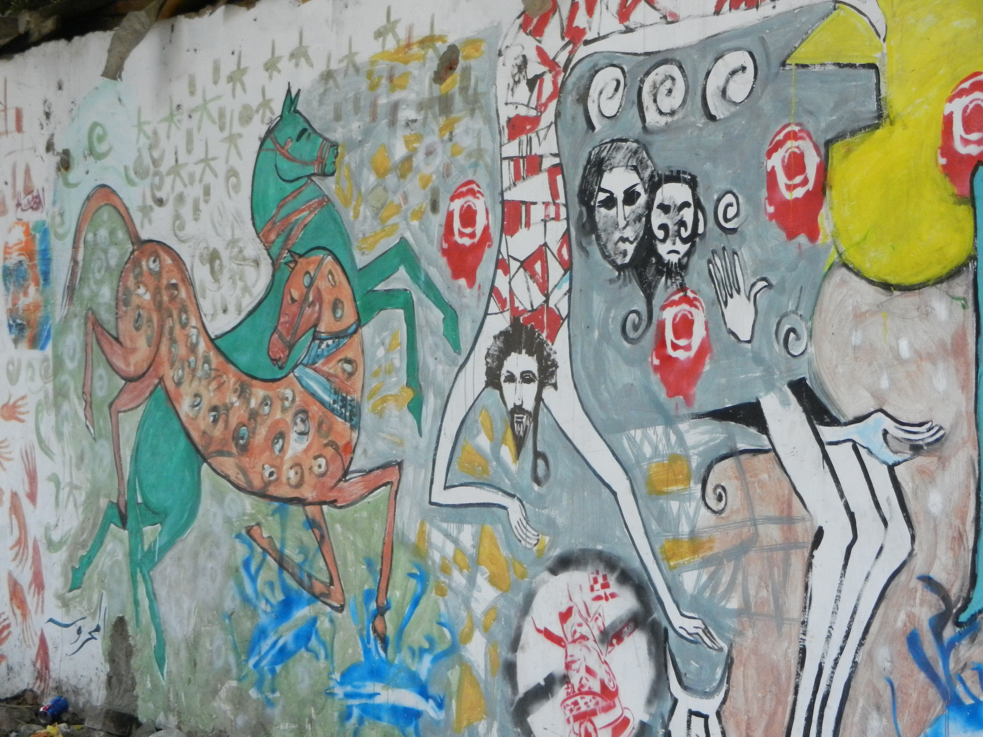 Les tags fleurissent à vitesse grand V sur les murs du Centre-ville, spécialement après certaines manifestations agitées. Puis ils sont effacés, remplacés… Dans la rue Mohamed Mahmoud, qui mène à la place Tahrir, et qui a vu nombre d’affrontements, en particulier fin 2011 – début 2012 (le café Costa dans lequel nous allions prendre le café a vu sa vitrine brisée un certain nombre de fois !), toute une série de dessins célébraient les « martyrs » de la Révolution. En passant dans cette rue avec un collègue membre du parti du 6th of April, j’ai eu l’impression de passer devant une tragique galerie de portraits de famille (« ici, c’est untel, qui est mort tel jour, ici c’est untel, qui a perdu la vue… » etc. D’ailleurs, je me souviens d’un jour fin 2011, où j’ai vu ce même jeune collègue égyptien entrer dans les bureaux de Bab el Louk avec un ami boitillant et l’oeil bandé, et m’anonçant qu’un de ses amis était décédé la veille dans une manifestation. Drôle de période…)