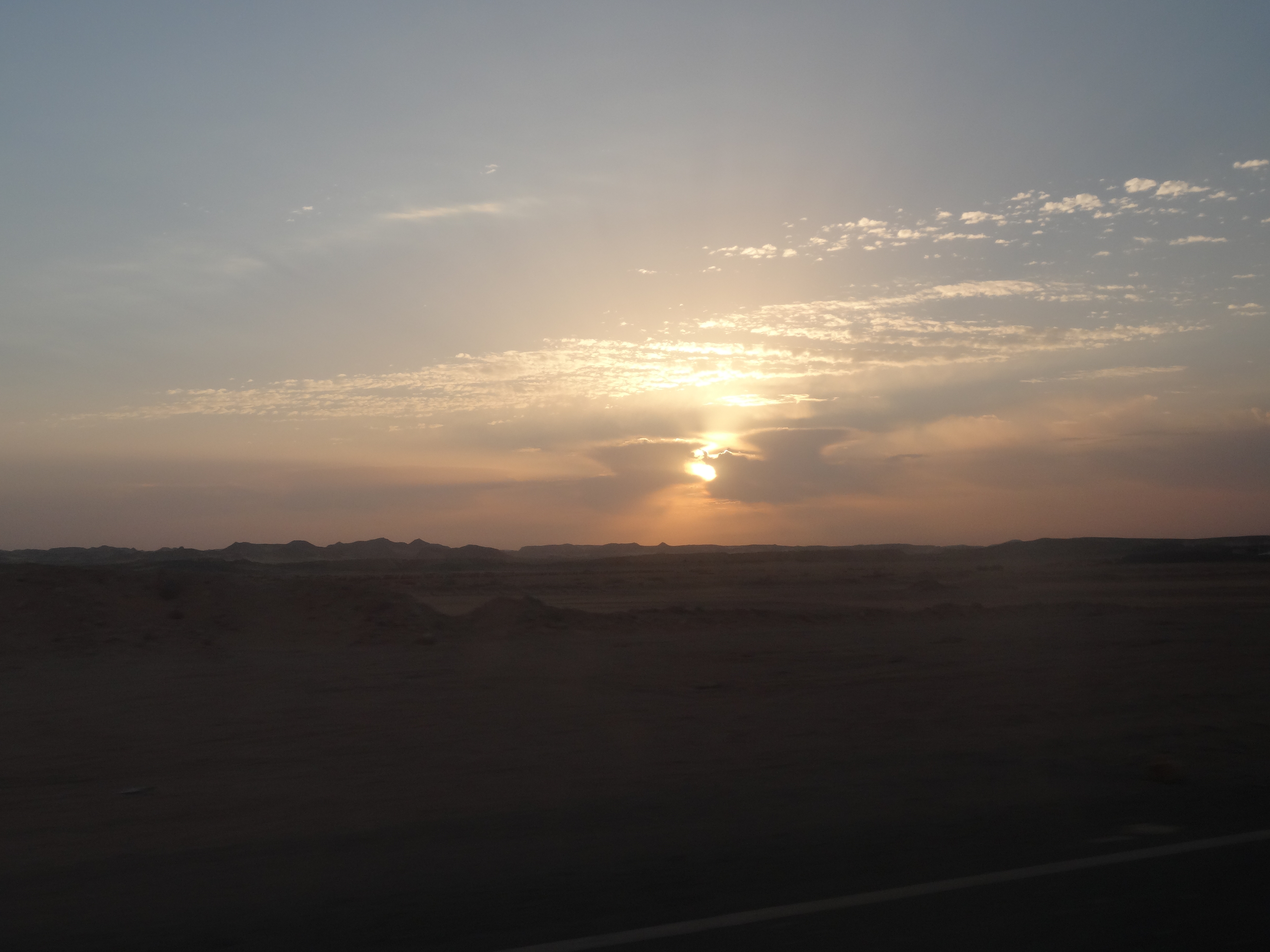 Impossible de me rendormir, donc j’ai pu voir notre chauffeur s’arrêter faire sa prière vers 5h30 et admirer le lever du soleil sur le désert.