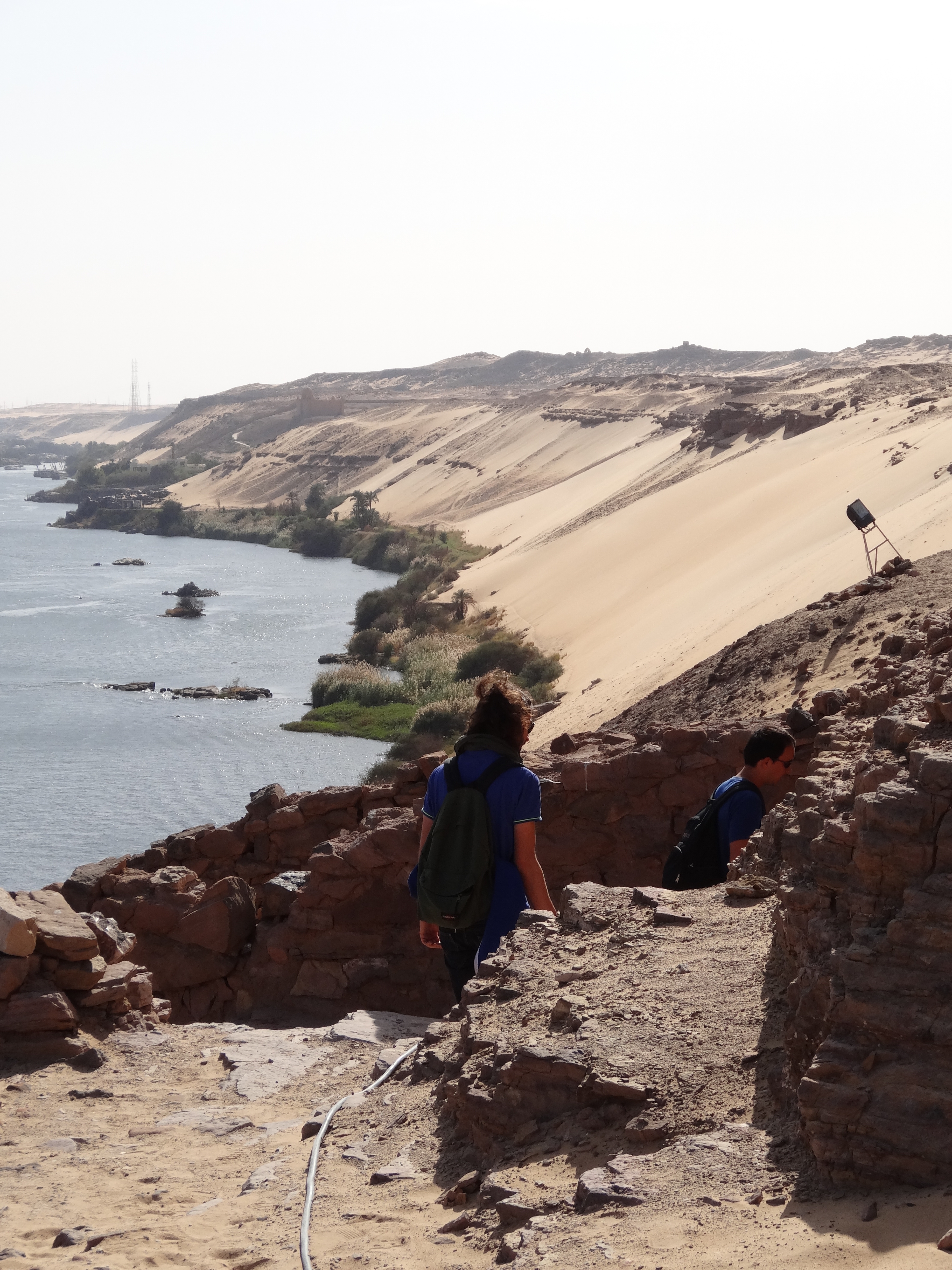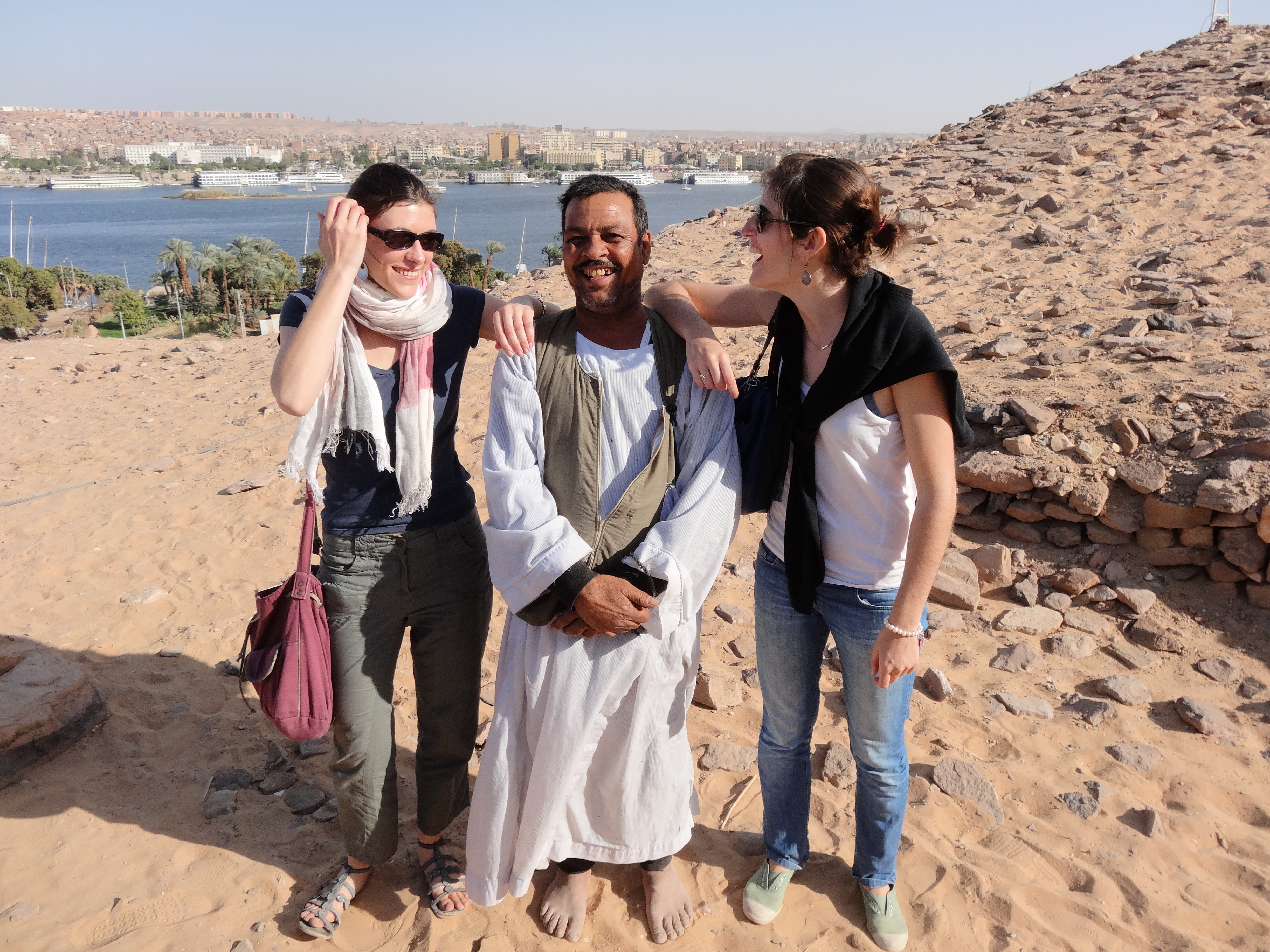 Au retour d’Abou Simbel, nous entreprenons de visiter les tombes des Nobles (des notables et hauts dignitaires de l’ancienne Egypte), sur l’autre rive, la rive Ouest, soit la rive des morts (comme à Louxor, la rive Est est la rive des vivants, la rive Ouest celle des morts). Les tombes se trouvent dans le coteau, sous le mausolée de Ali Ben el-Hawa, que l’on aperçoit tout en haut.