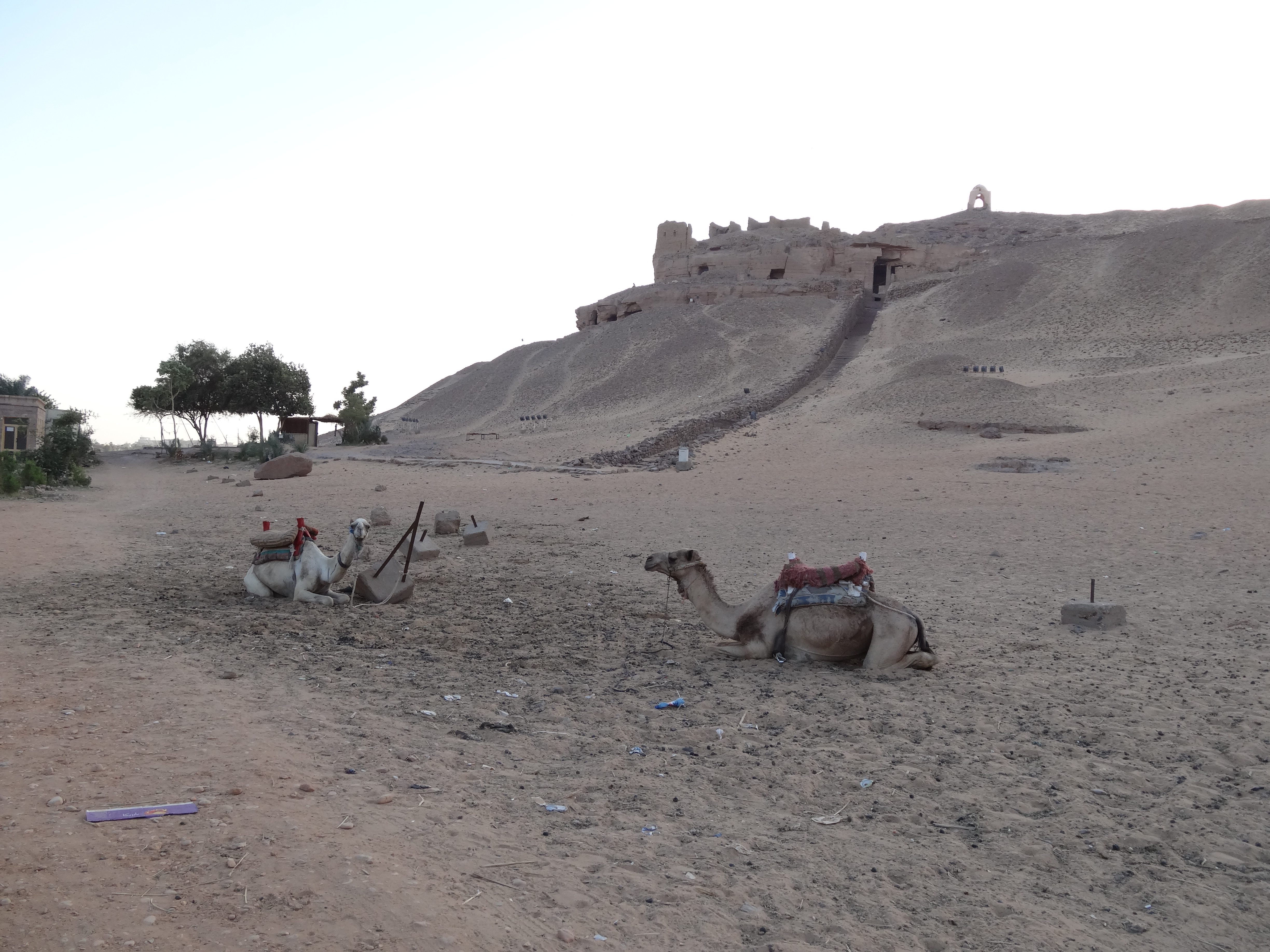 Nous hésitons à faire un tour en chameau, mais il est déjà tard, donc nous entreprenons de grimper à flanc de coteau vers les tombes.