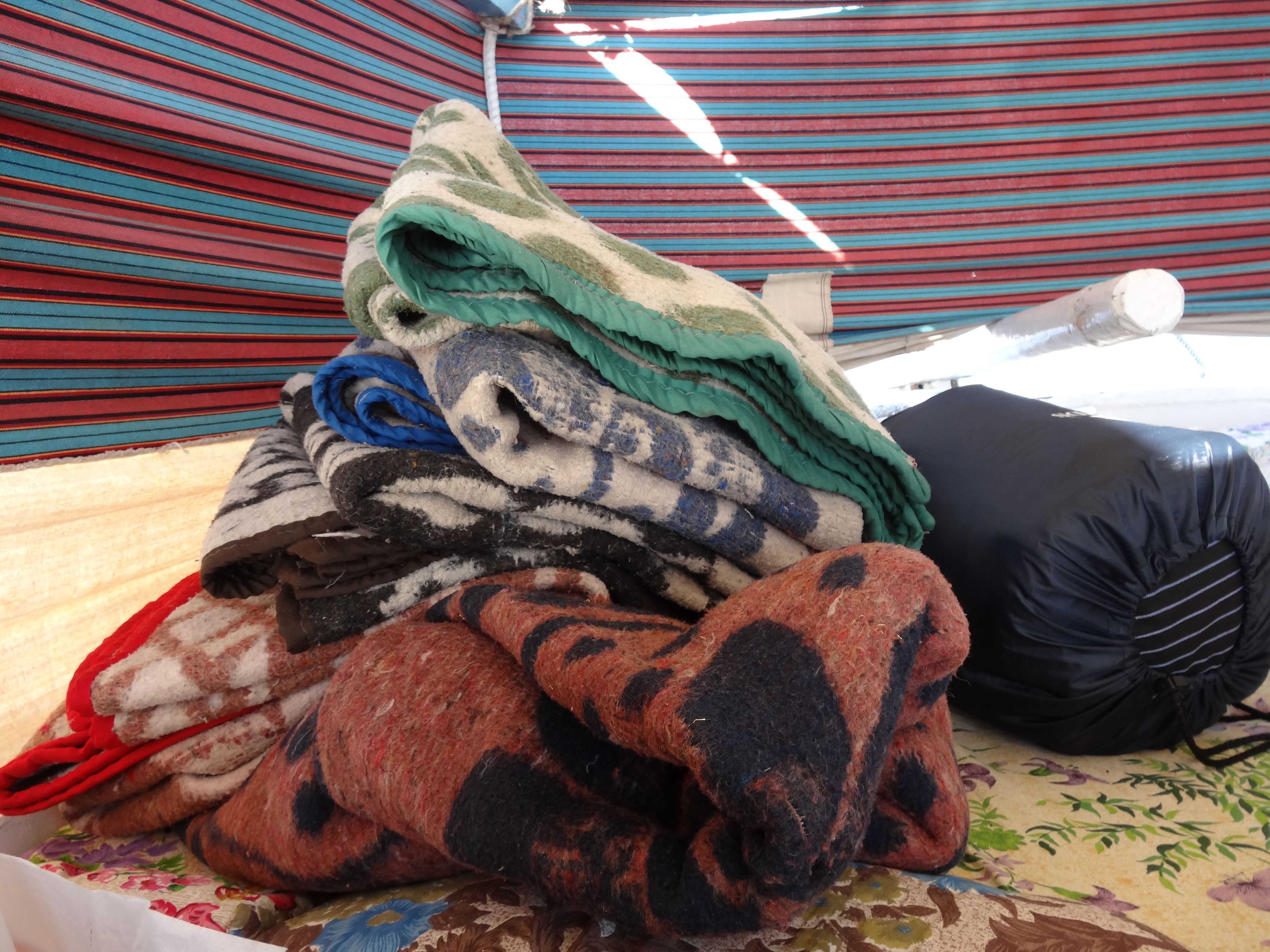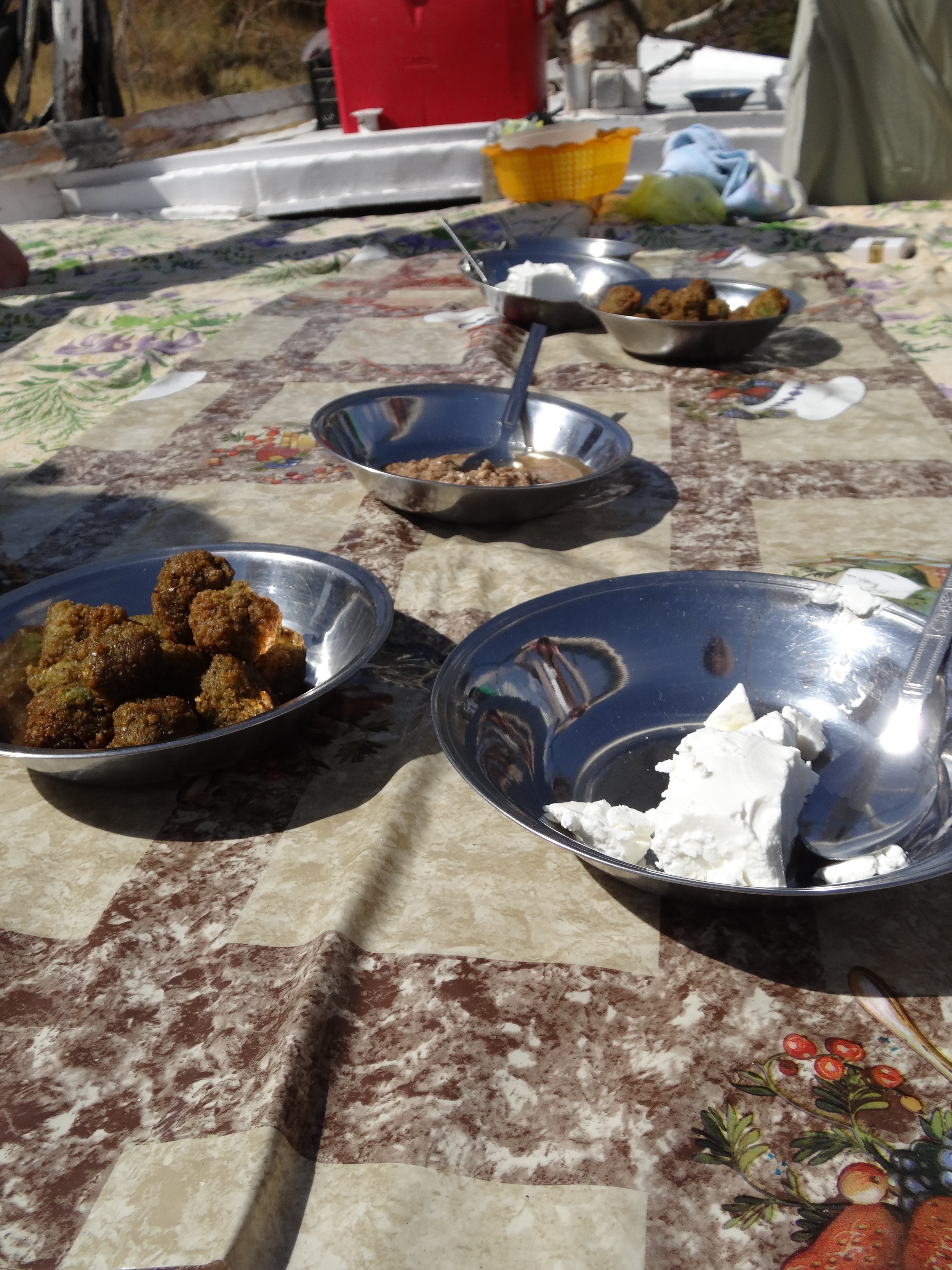 On installe le bout de toile cirée en guise de table et de nappe, et c’est parti ! Falafels, poulet grillé, boulettes de viande épicées, salade de légumes, tahina, baba ghanough, riz, frites maison, soupe de lentilles, aubergines frites, fromage frais istanboulli, délicieuses dattes et mandarines… Et tous les jours, en milieu de matinée et d’après-midi, on prend le thé, l’excellent thé baladi qu’il faut sucrer, et qui reste au fond du verre…