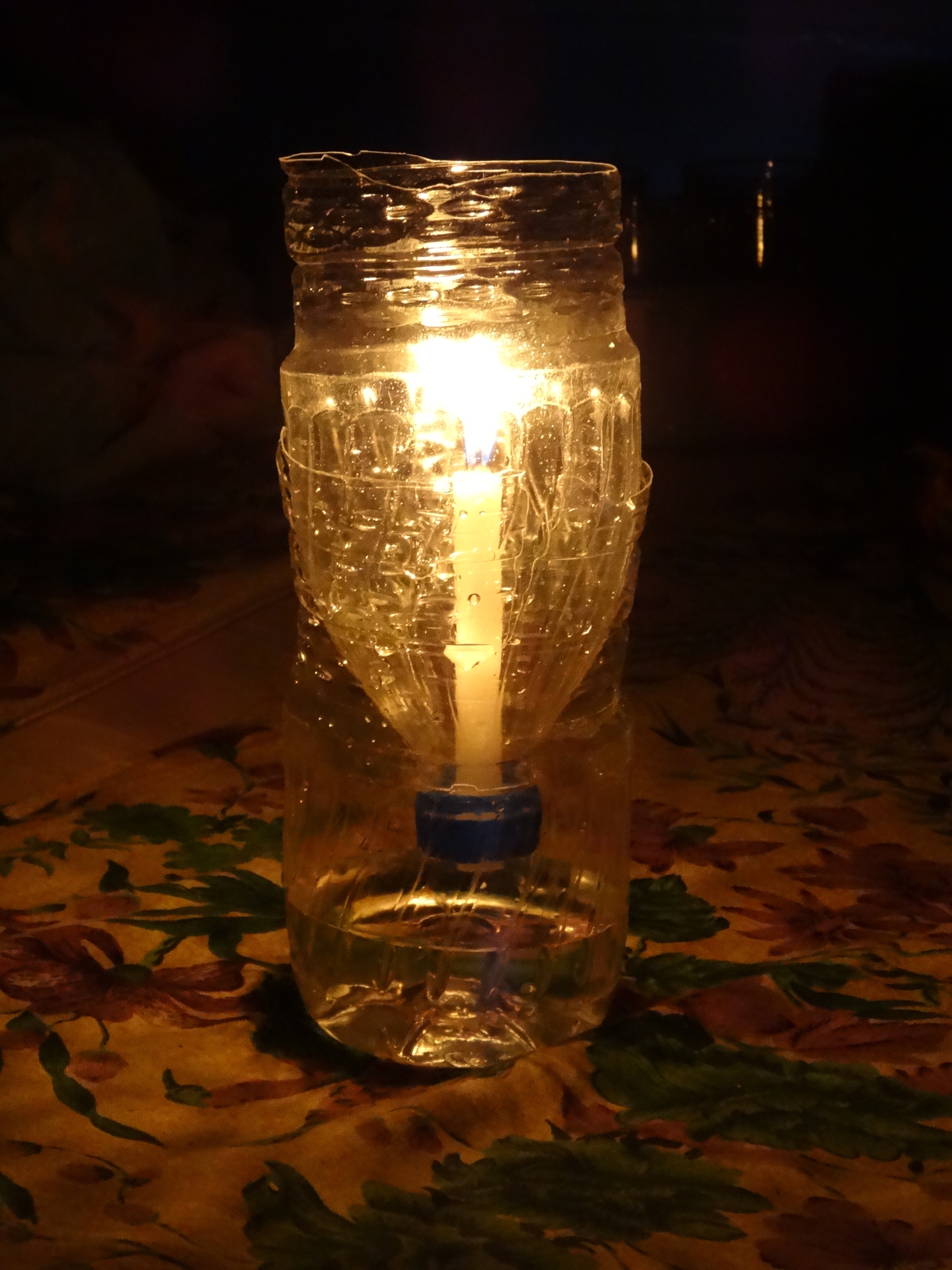 Pour le feu de camp, Ali nous envoie chercher des petits branchages, et l’éclairage du dîner, ce sont des bougies dans des bouteilles en plastique.