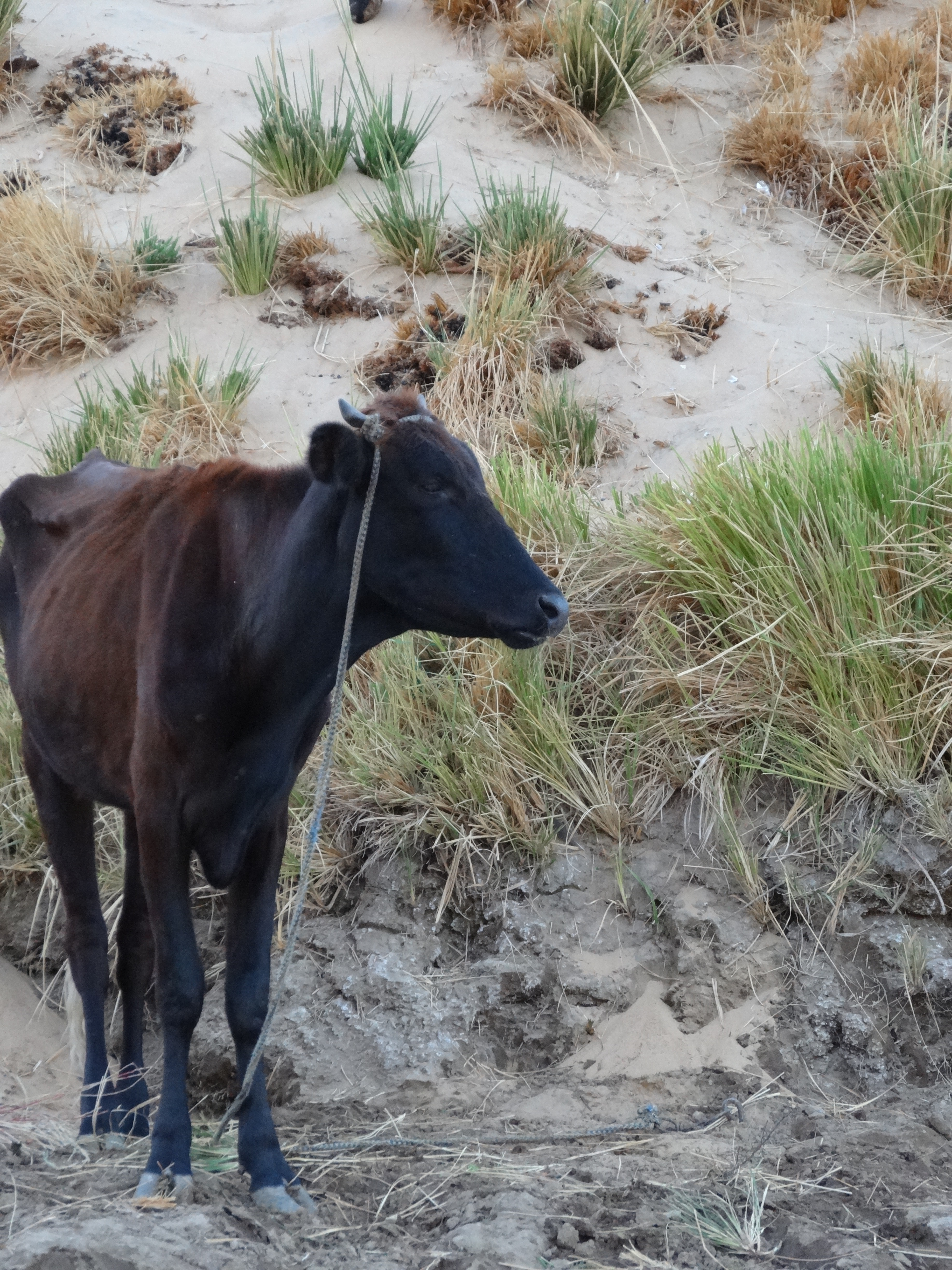 Nous voyons aussi nombre d’animaux, certains de loin, d’autres de tout près, comme la vache cornue (accompagnée de son veau et un peu agressive, heureusement qu’elle était attachée) et un âne très amical.