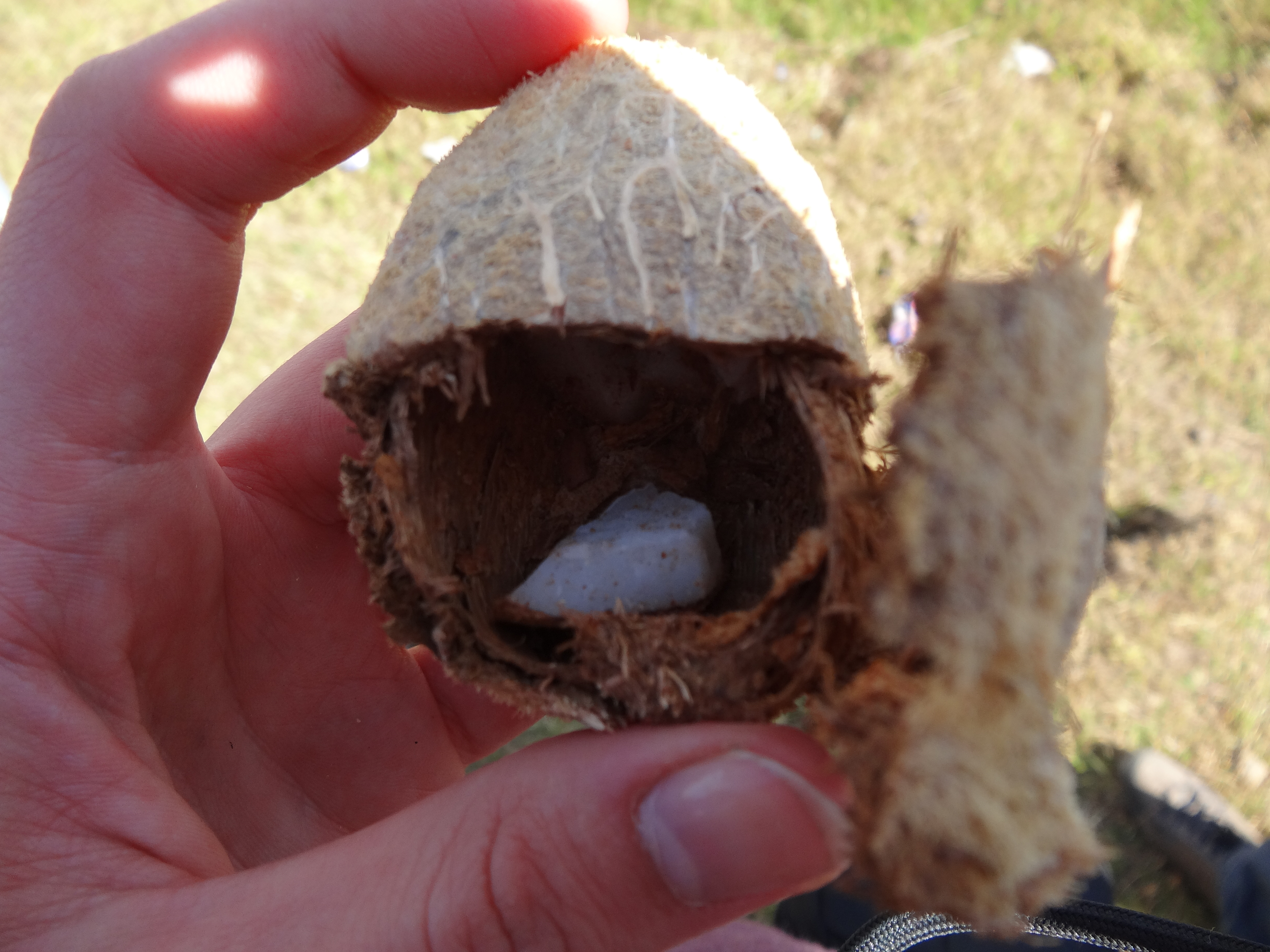 Julian s’est dévoué pour tenter d’ouvrir l’un de ces fruits, mais trop coriace, il ne faisait que rebondir sans s’ouvrir.