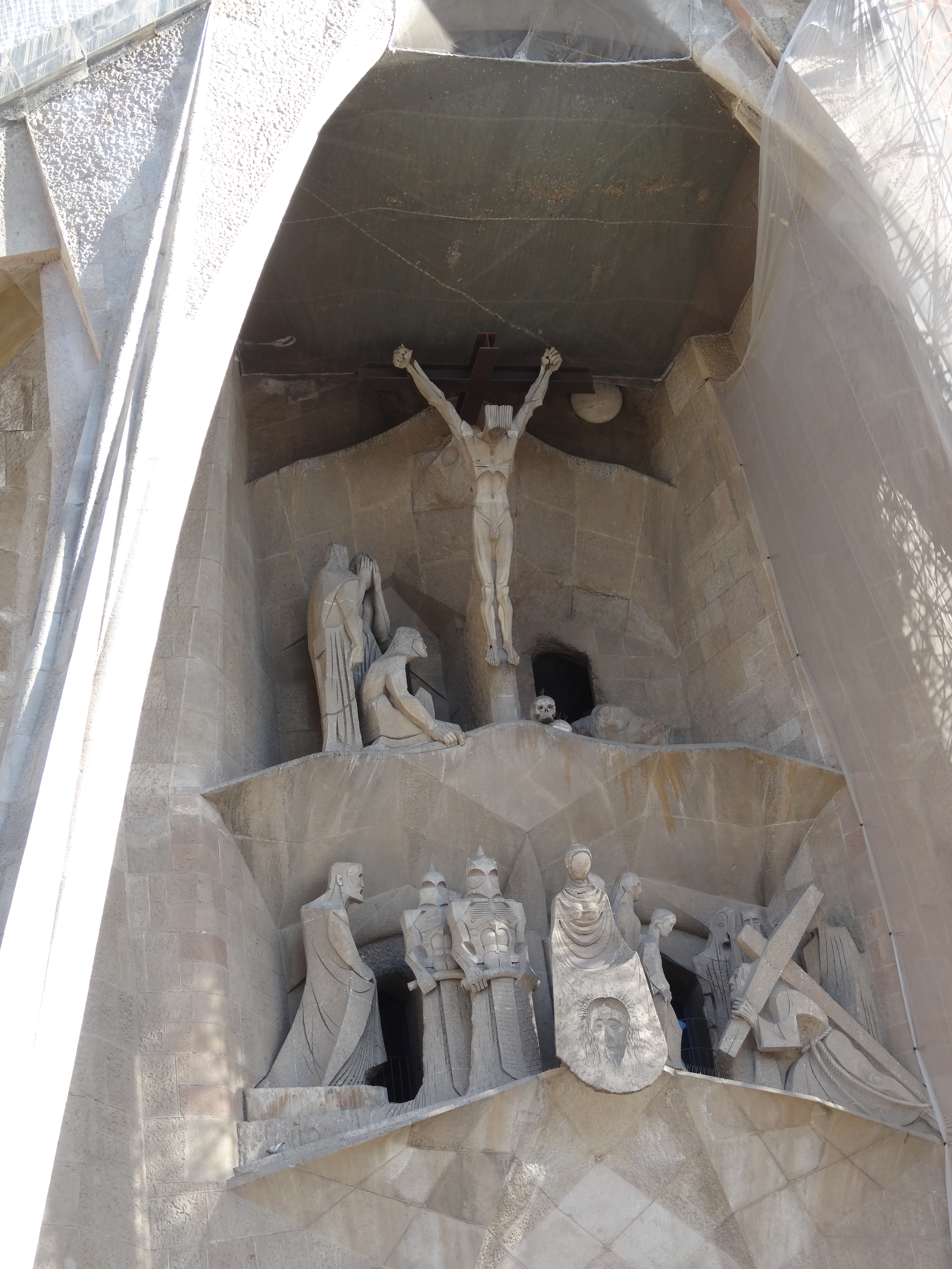 La façade de la Passion, la mort, sobre, aux arêtes rudes :
