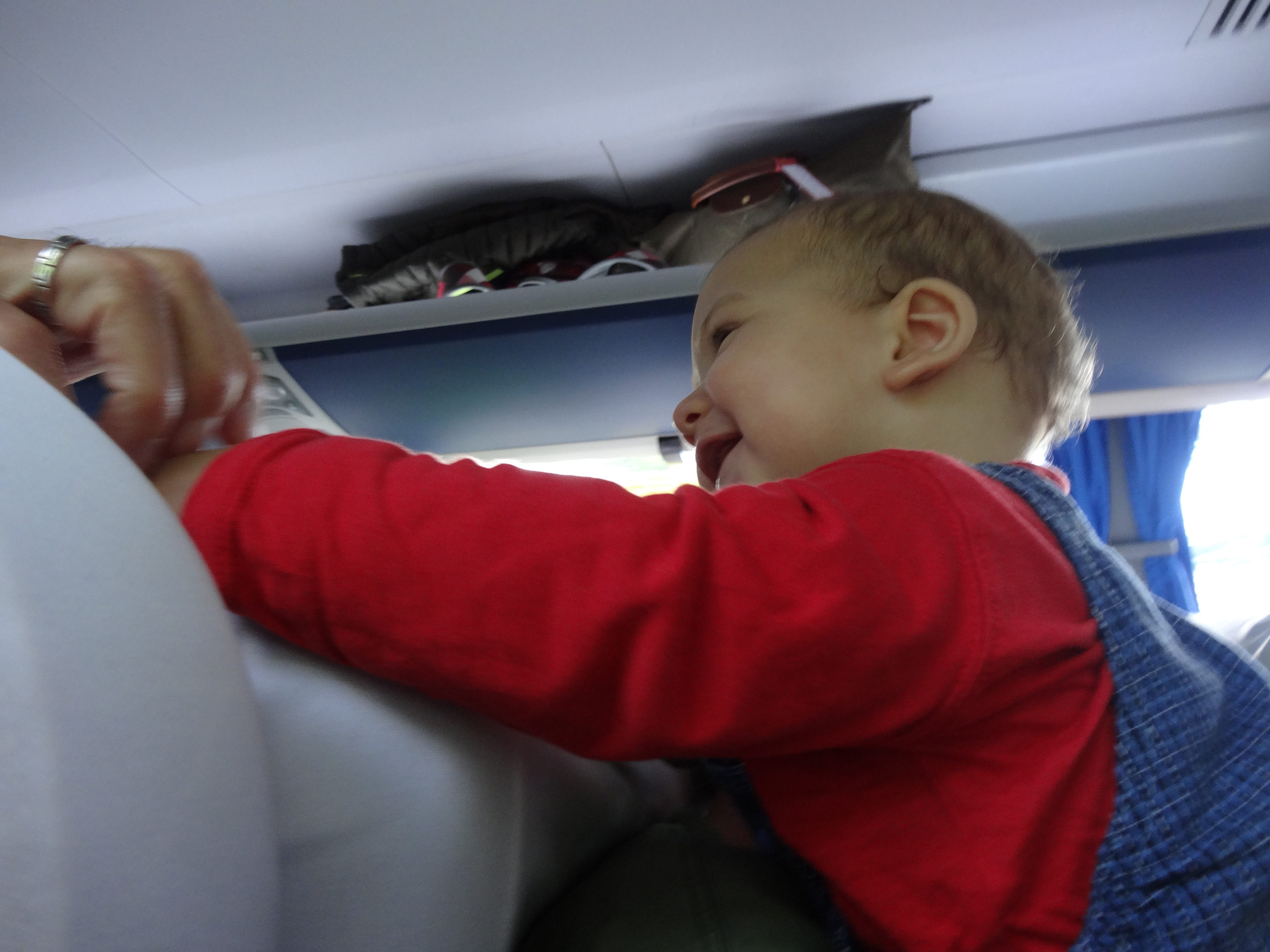 Adrien a sympathisé avec nos voisins de derrière, d’à côté, de devant, d’un peu plus derrière… ce qui l’a bien occupé. Il a essayé de manger une pomme (sans dent, pas évident). Il a quand même un peu chouiné et un peu dormi.
