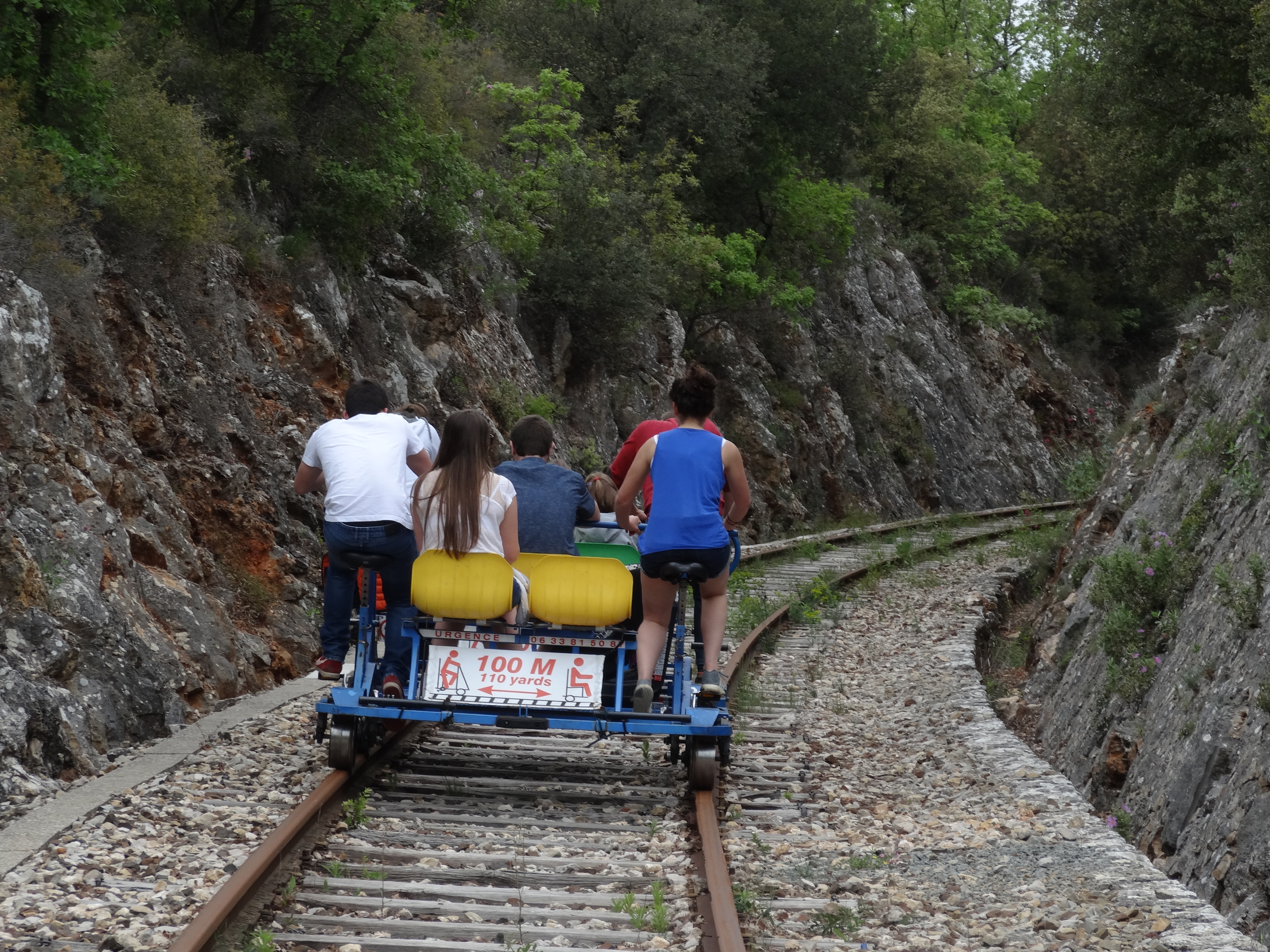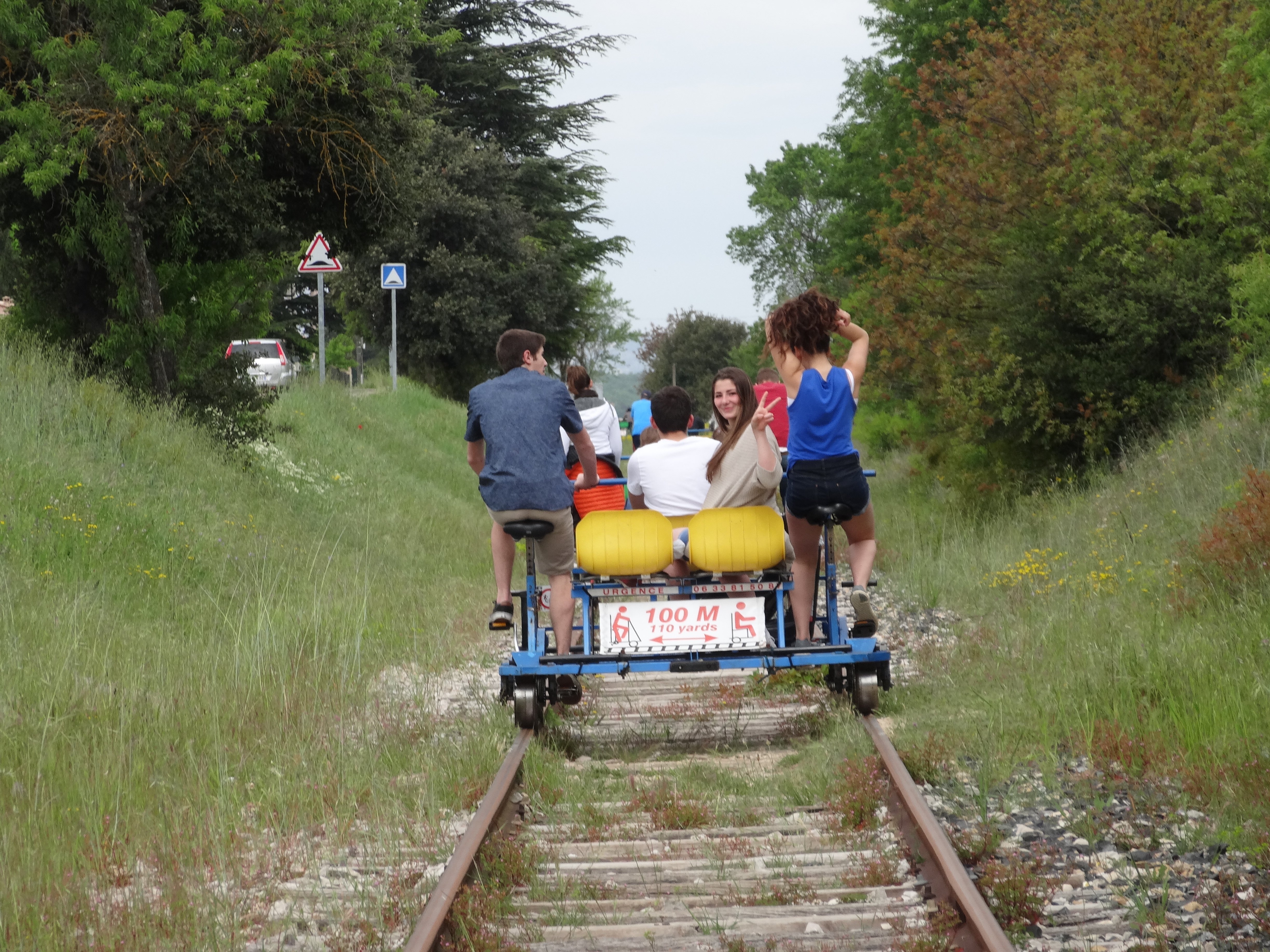 Le vélo rail est un train à pédales, ou encore une sorte de pédalo sur rail…. Sur une ancienne voie ferrée, de 2 à 5 personnes par véhicule se lancent à l’assaut d’un circuit bucolique, 15km pour le circuit de Saint Maximim. On part en convoi de 20 véhicules maximum, en laissant une certaine distance entre chaque vélo-rail, le jeu étant bien sûr d’essayer de rattraper le précédent. Deux personnes pédalent, tandis que les autres admirent le paysage en attendant de prendre le relai, car les côtes demandent un certain effort ! Il faut mesurer 1.40 minimum pour pouvoir pédaler. Le vélo-rail de Saint Maximim offre un circuit de 15km (aller et idem au retour). Au niveau des passages à niveau, deux passagers sautent de voiture pour aller soulever les barrières en tissu, en vérifiant bien que la voie est libre.